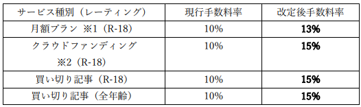 ※月額プラン(全年齢)、クラウドファンディング(全年齢)の料率は10%から変更はございません。