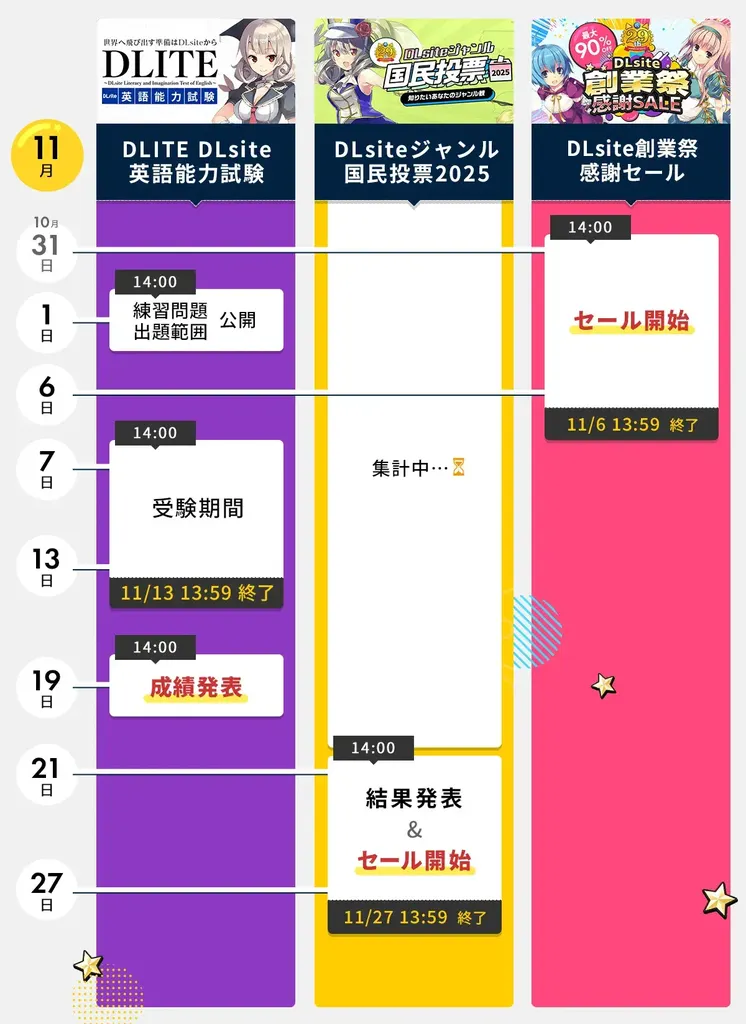 DLsiteや2次元コンテンツにまつわる英語試験を全3科目で実施します。